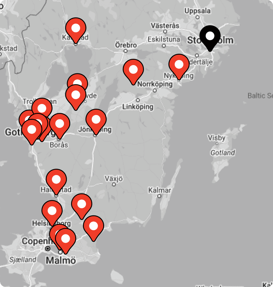Vi är stolta över vår närvaro på över 20 strategiska platser runt om i hela Sverige för att kunna erbjuda dig den bästa servicen och möjligheter till jobb.